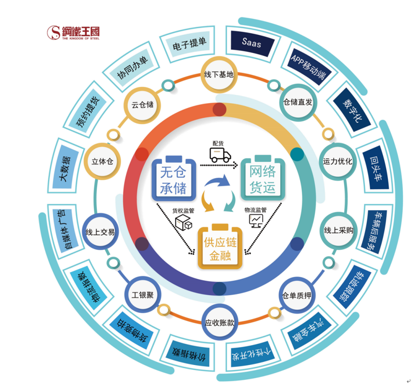 钢铁王国在线交易、云仓储板块构成钢铁王国供应链服务体系的底层基础设施。2021年,钢铁王国交易平台注册会员3.1万家,平台交易量超过400万吨。钢铁王国旗下云仓储平台共加盟仓库28家,年业务量超2700万吨,钢材货值超1000亿元,占广州地区钢铁物流市场份额超70%。两大板块为钢铁王国的数据、金融、网络货运服务提供了强大的数据基础及风控支撑。